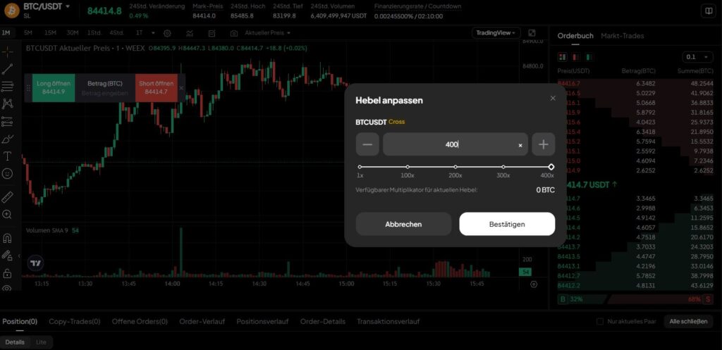 Eine der Stärken von WEEX ist der Hebel von bis zu 400x bei Terminkontrakten. Diese Funktion ermöglicht es Händlern, ihre Positionen mit reduziertem Anfangskapital zu verstärken, was besonders attraktiv sein kann für diejenigen, die die Risiken gut beherrschen.
