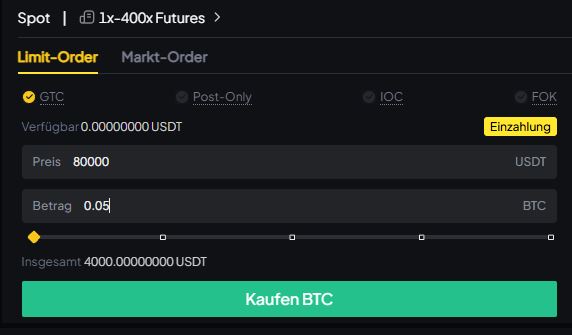 Schließlich bietet WEEX große Flexibilität bei der Orderverwaltung durch eine vielfältige Palette : Market-, Limit– oder Stop-Limit-Orders für klassische Bedürfnisse. Es gibt auch fortgeschrittene Optionen wie Good-Till-Cancelled (GTC), Post Only oder Fill-Or-Kill (FOK).