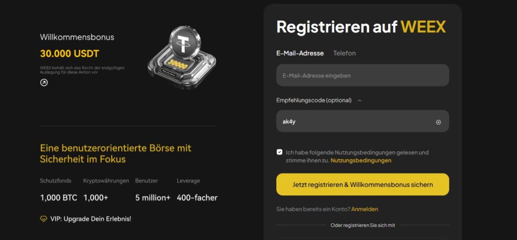 Registrierung : Besuchen Sie die Website www.weex.com oder laden Sie die mobile App herunter. Klicken Sie auf „Registrieren“, geben Sie Ihre E-Mail oder Telefonnummer ein und erstellen Sie ein sicheres Passwort. Vergessen Sie nicht den Empfehlungscode „ku3x“ für zusätzliche Vorteile.