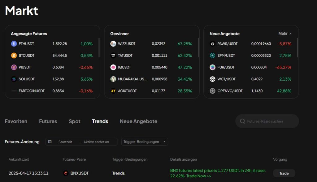 Allerdings beschränkt das Fehlen von Ein- und Auszahlungen in Fiat-Währung den Zugang für Neueinsteiger in der Kryptowelt. Trotz seiner Einschränkungen bietet die Plattform ein umfassendes Spektrum an Dienstleistungen im Zusammenhang mit Kryptohandel, über Copy Trading, Terminkontrakte (Futures) oder Spothandel.