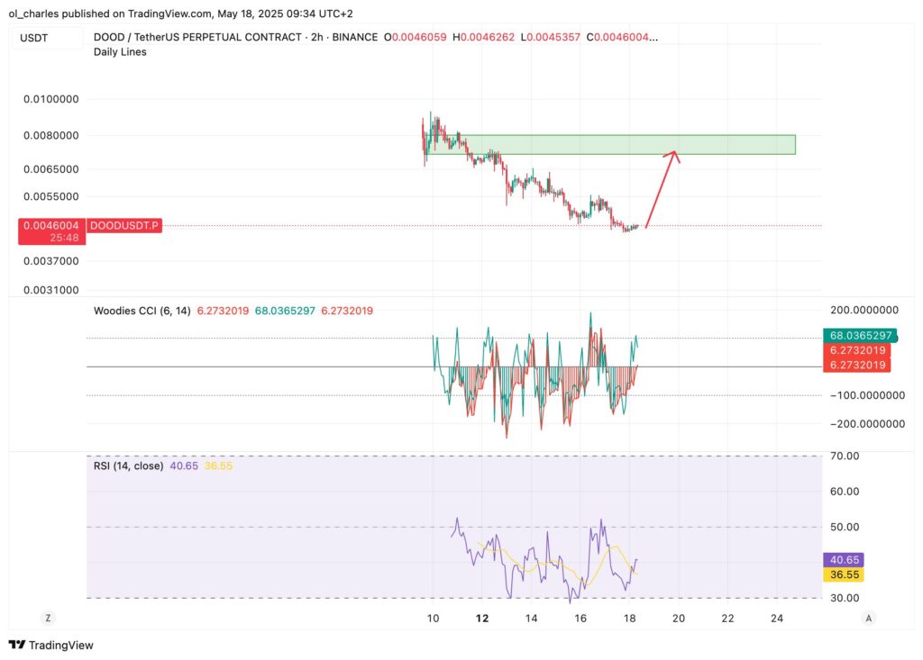 Der DOOD-Preis steht vor einem wichtigen Widerstand bei 0,0052 $. Ein Durchbruch dieses Niveaus wäre notwendig, um ein mögliches Rebound zu signalisieren und den Weg für eine Bewegung in Richtung 0,00735 $ zu ebnen. Ein anhaltender Abwärtsdruck könnte DOOD jedoch unter die Unterstützung von 0,0040 $ fallen lassen, was neue Tiefststände markieren und das Marktvertrauen weiter erodieren würde.