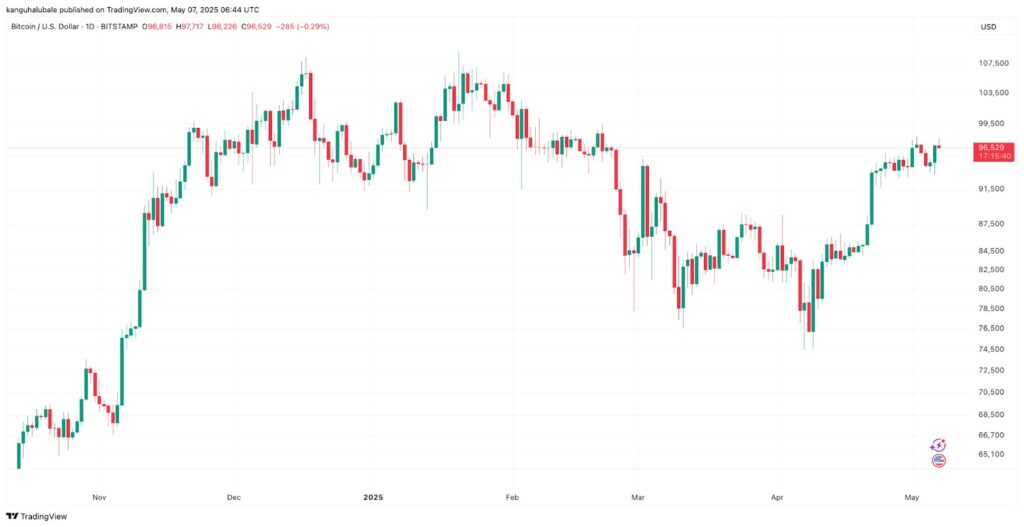Bitcoin (BTC) erlebt am 7. Mai einen erneuten Kursanstieg. Der Kurs übersteigt 97.000 $ und das tägliche Handelsvolumen steigt stark um 37 %. Diese Dynamik wird durch mehrere Schlüsselfaktoren erklärt: