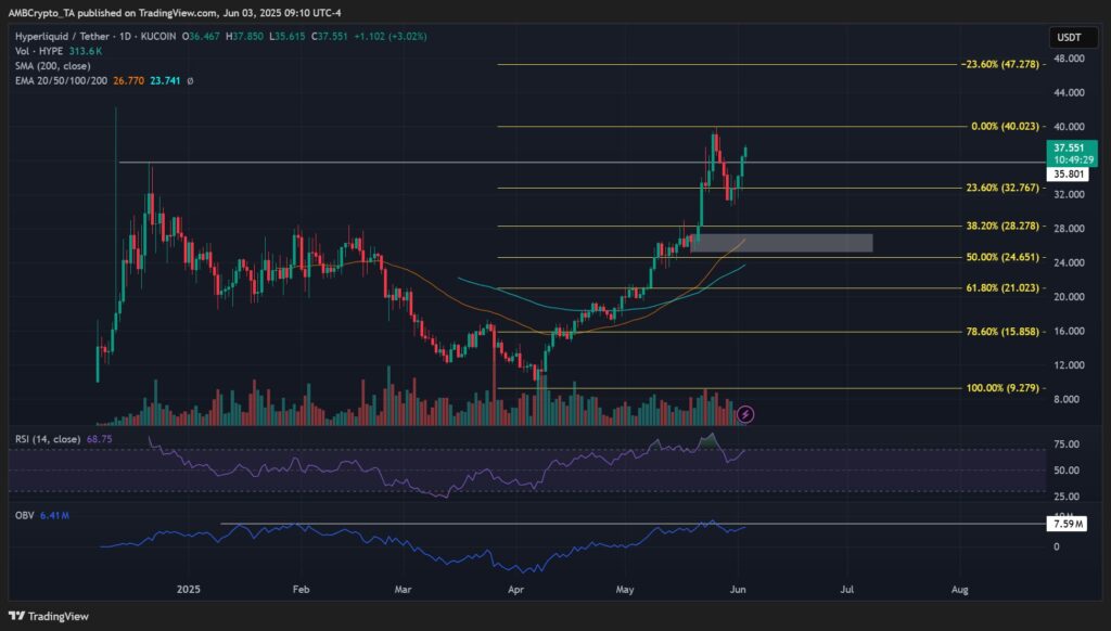 Der HYPE-Token, der kürzlich an der Börse Binance US gelistet wurde, verzeichnete nach dieser Ankündigung einen beeindruckenden Anstieg von fast 20%. Mit einem Preissprung von 31 $ auf 37,85 $ seit Sonntag hat der Token seit seinen Tiefstständen im April ein Wachstum von 300% erzielt. Derzeit nähert sich der Token seinem historischen Höchststand von 42,2 $, der im Dezember letzten Jahres auf der KuCoin-Plattform erreicht wurde.