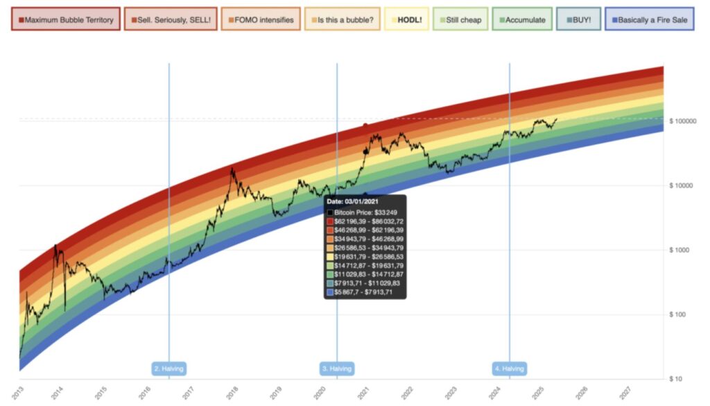 Bei seinem aktuellen Preis von 110.000 $ befindet sich Bitcoin in der HODL-Zone des Rainbow Charts, einem mittleren Band, das auf eine angemessene Bewertung im Vergleich zu seiner Wachstumshistorie hinweist.