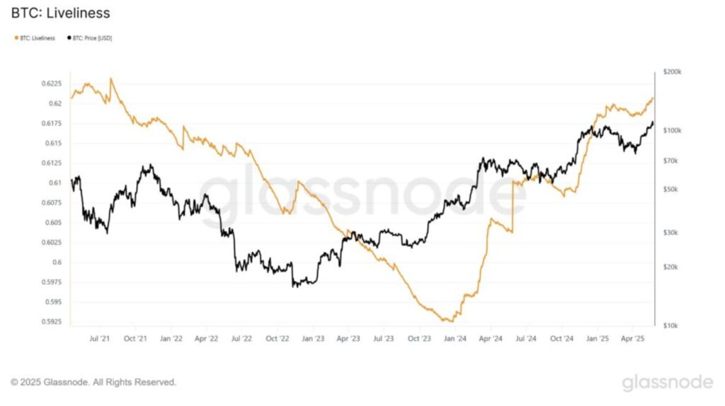 Die „Liveliness“ von Bitcoin, ein wichtiger Indikator zur Verfolgung der Aktivität von Langzeit-Haltern (DLT), hat kürzlich den höchsten Stand seit fast 4 Jahren erreicht. Dieser Anstieg deutet darauf hin, dass diese langfristigen Investoren beginnen, ihre Gewinne zu realisieren – ein Verhalten, das Fragen zur Nachhaltigkeit der jüngsten Aufwärtsrallye aufwirft.
