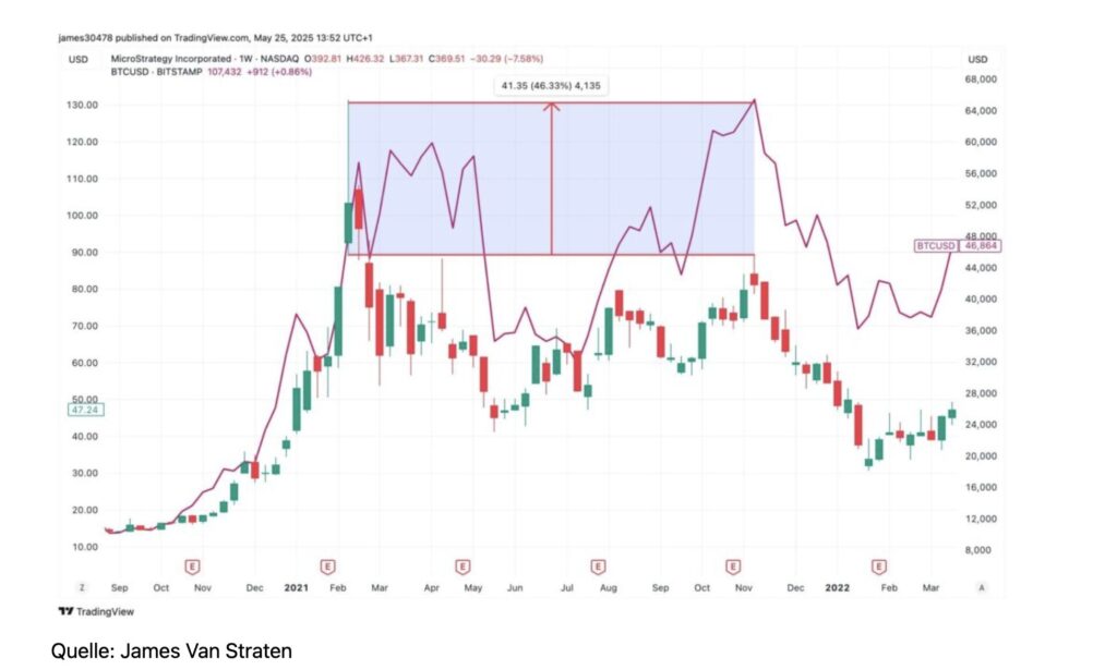 Interessanterweise hat Analyst James Van Straten auch eine Divergenz zwischen dem Bitcoin-Preis und dem Kurs der MicroStrategy-Aktie (MSTR) festgestellt. Während letztere seit ihrem Höchststand um etwa 50% gefallen ist, erreicht Bitcoin weiterhin neue Allzeithochs.
