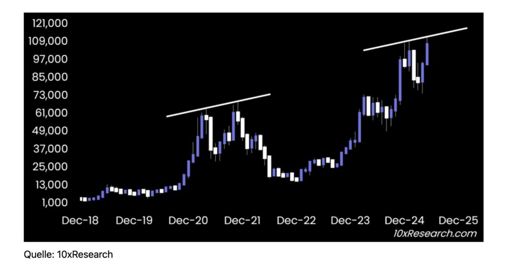 Zunächst warnt ein aktueller Bericht von 10xResearch davor, dass Bitcoin eine Widerstandszone erreicht hat und ein Preismuster bildet, das dem von 2021 ähnelt – mit zwei Höchstständen, wobei der zweite höher ist als der erste. Dieses Muster scheint sich 2025 zu wiederholen, was beunruhigende Parallelen zwischen beiden Zeiträumen aufzeigt.