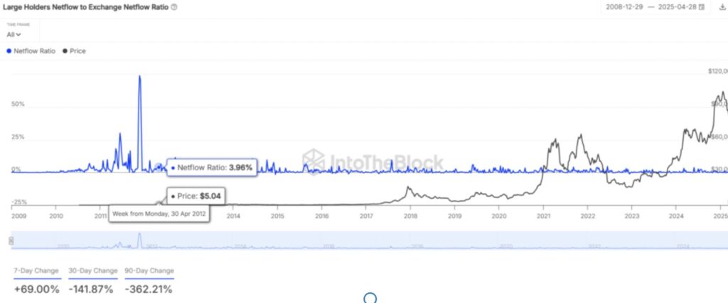 Bezüglich des Verhaltens großer Investoren gibt es signifikante Veränderungen. Das Verhältnis des Nettoflusses von Börsen innerhalb von 7 Tagen stieg tatsächlich um 69 %, was darauf hindeutet, dass sich die Wale entweder auf den Verkauf oder auf die Neupositionierung nahe eines wichtigen Widerstandsniveaus vorbereiten. Historisch gesehen gehen solche Anstiege im Nettofluss oft großen Bewegungen am Markt voraus.