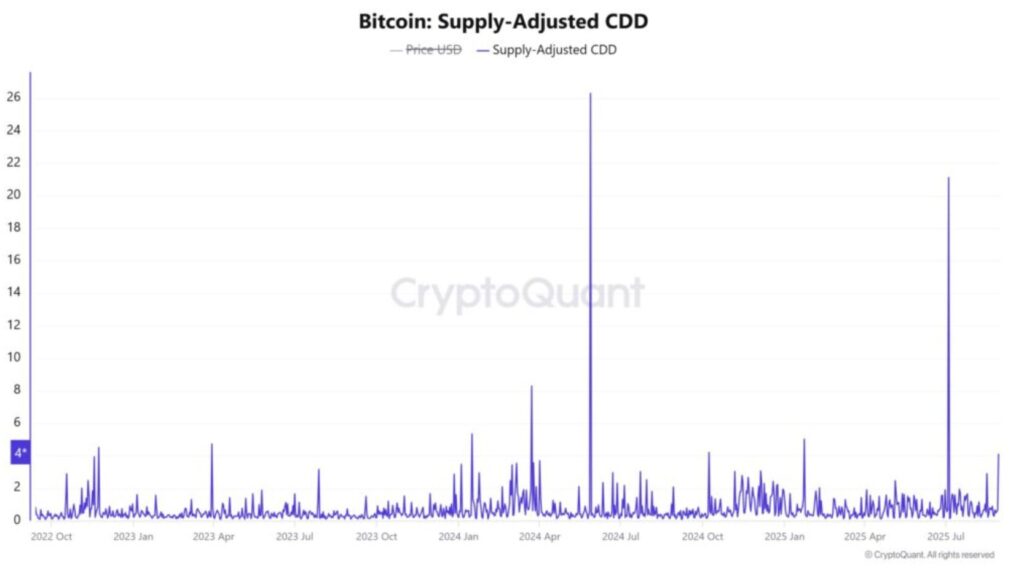 Darüber hinaus ist das angebotsbereinigte Coin Days Destroyed (CDD)-Verhältnis in die Höhe geschnellt, was eine verstärkte Aktivität von langfristigen Haltern (LTH) widerspiegelt. Dieser Anstieg deutet darauf hin, dass die erfahrensten Investoren an den jüngsten Verkäufen beteiligt sind und ihre Gewinne bei Marktstärke sichern. Zusammen mit den Gewinnen der Wale zeigt diese Dynamik, dass erfahrene Halter gegenüber einer jüngeren Nachfrage verteilen, die einem höheren Rückschlagsrisiko ausgesetzt ist.