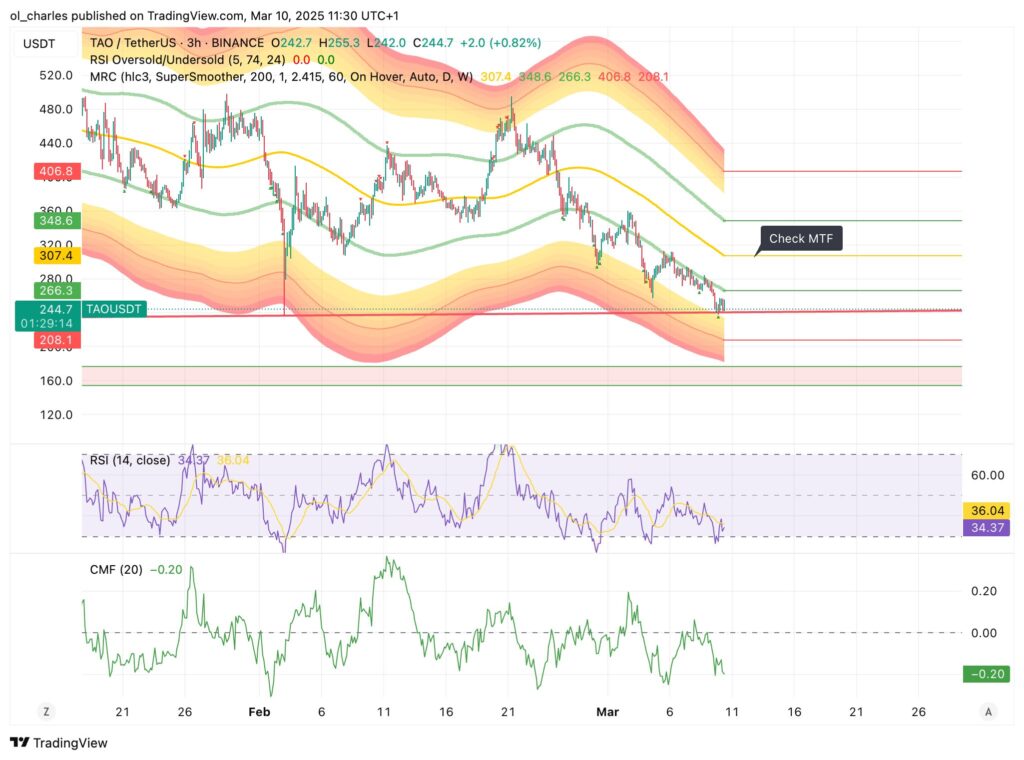 Basierend auf der Leistung von Bitcoin könnte Bittensor unter 240 $ fallen oder sich entscheiden, seinen Abwärtstrend umzukehren.