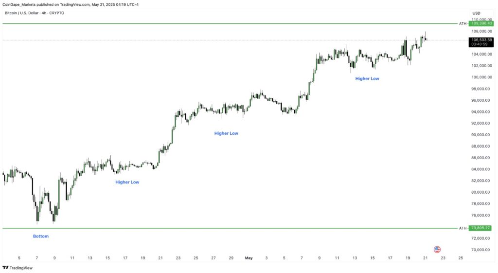 Um die kurzfristigen Prognosen für den Bitcoin-Preis zu bestimmen, ist ein umfassender Ansatz am besten geeignet. Wenn die Dynamik stark genug ist, wird BTC 110.000 $ oder mehr erreichen. Der 4-Stunden-Chart zeigt eine Reihe von immer höheren Tiefs, seit BTC im April ein signifikantes Tief bei etwa 73.000 $ etabliert hat. Diese Preisstruktur deutet auf eine klare bullische Stärke und Dynamik hin, was auf eine Fortsetzung des positiven Trends und einen möglichen Anstieg zum Allzeithoch hindeutet.