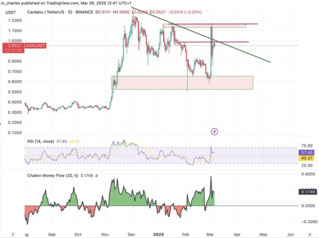 Diese optimistische Prognose stützt sich auf mehrere technische und fundamentale Faktoren. Zunächst zeigt die Chartanalyse, dass der ADA-Preis es geschafft hat, seinen wöchentlichen Abwärtstrend zu durchbrechen, was auf ein erhebliches Erholungspotenzial hindeutet. Das Überwinden eines Schlüsselwiderstandsniveaus von 1,14 $ könnte die Einleitung eines Aufwärtstrends in Richtung der 2-Dollar-Marke bestätigen.