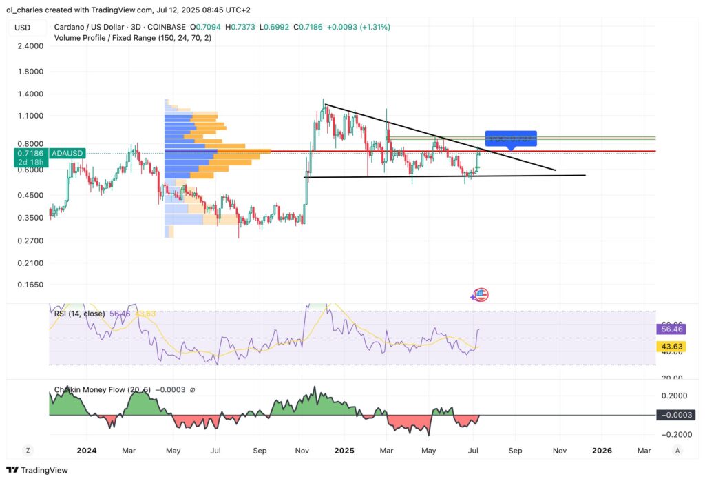 Ein Überschreiten dieses Schwellenwerts würde eine noch stärkere Aufwärtsdynamik für ADA signalisieren. ADA befindet sich derzeit im oberen Bereich eines Dreiecks im HTF. Ein Durchbruch dieses Widerstands bei 0,75 Dollar würde ADA in Richtung eines Short Squeeze und einer Kursbeschleunigung auf 1,2 Dollar und anschließend zu neuen Allzeithochs treiben.