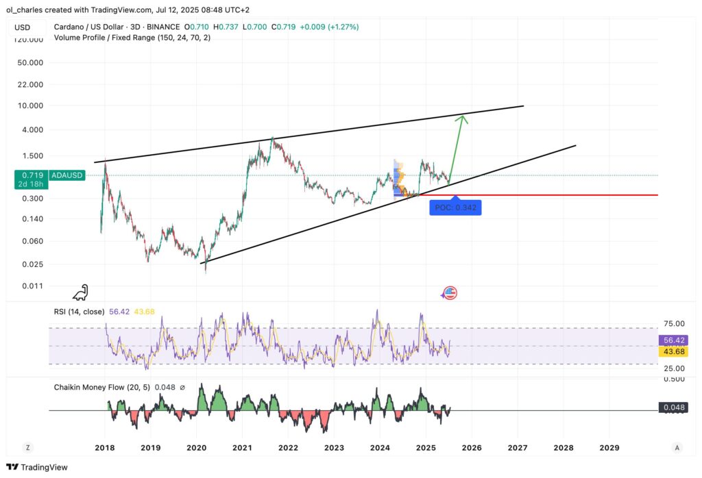 Im HTF bildet ADA einen aufsteigenden Kanal, der auf einen potenziellen Anstieg zwischen 5 und 7 Dollar für ADA am Ende dieses Zyklus hindeutet. Das entspricht einem Anstieg um das 7- bis 9-fache des aktuellen Preises.