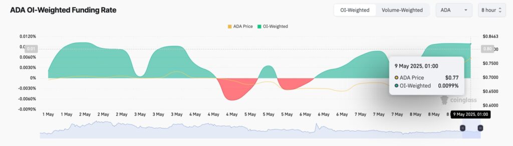 Auf dem ADA-Derivatemarkt bleibt der Finanzierungssatz deutlich positiv, was darauf hindeutet, dass Händler massiv Long-Positionen für zukünftige Gewinne eingehen. Derzeit bei 0,0099%, zeigt dieser Satz den starken Wunsch der Marktteilnehmer, auf den Fortbestand des Aufwärtstrends zu wetten. Der Finanzierungssatz, ein Mechanismus zur Aufrechterhaltung der Preisparität zwischen dem dauerhaften Terminkontrakt und dem Spotmarkt, veranschaulicht das gestiegene Vertrauen der Investoren in Cardano.