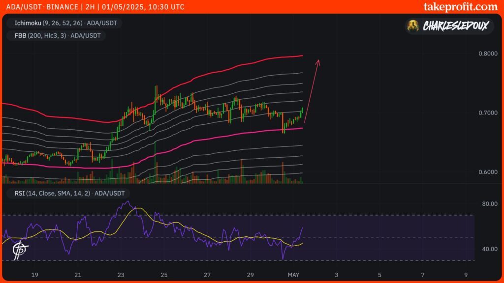 Zum Zeitpunkt der Abfassung liegt der ADA um 2,6 % im Plus und wird bei 70 Cent gehandelt. Mit einem stark gestiegenen RSI könnte der Preis sich in Richtung des oberen Bollinger Bandes (FBB) und des Widerstandsniveaus von 0,80 Dollar beschleunigen, was einem potenziellen Anstieg von über 13 % entspricht.
