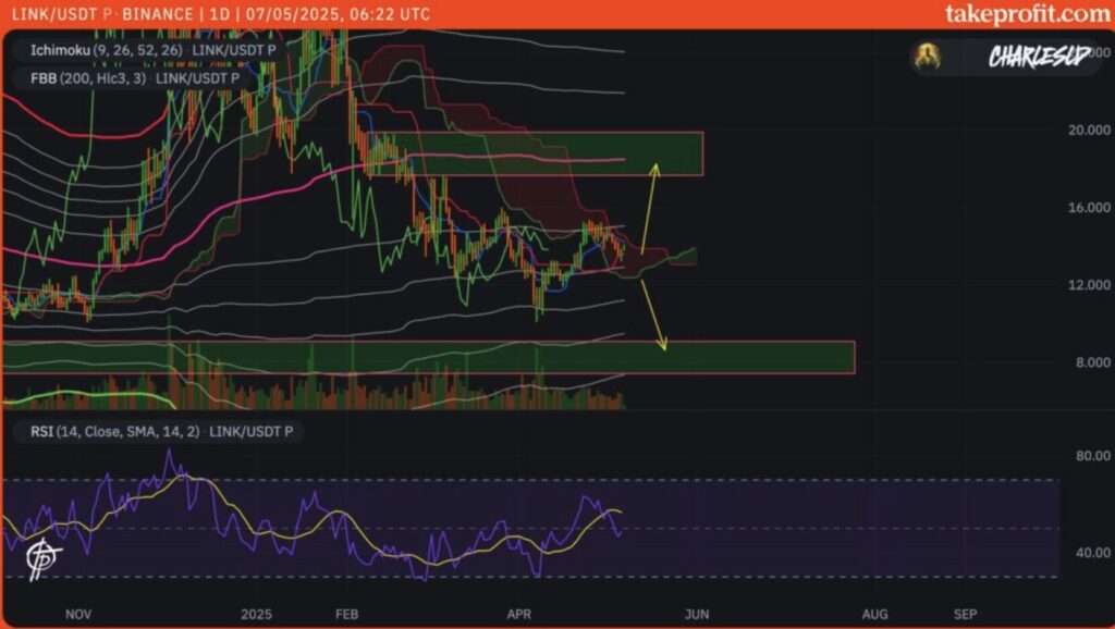 Aktuell hat es der LINK noch nicht geschafft, sich aus seiner täglichen Ichimoku-Wolke zu befreien. Der Widerstand von 15 Dollar ist kurzfristig noch entscheidender.