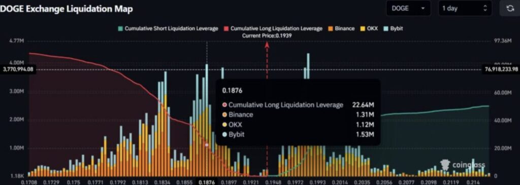 Dennoch zeigt die Analyse der Aktivitäten von Händlern und Investoren einen deutlichen Aufwärtstrend und eine Akkumulation von DOGE-Tokens. Zum Zeitpunkt der Analyse beliefen sich die Long-Positionen mit Hebelwirkung auf 22,64 Millionen Dollar, was die 18,85 Millionen Dollar an Short-Liquidationshebeln deutlich übertraf.