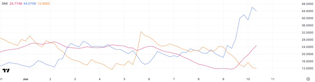 Der Directional Movement Index (DMI) von Ethereum zeigt einen bemerkenswerten Anstieg der Trendstärke. Der Average Directional Index (ADX) ist von 11,58 auf 24,77 innerhalb nur eines Tages gestiegen. Der ADX misst die Stärke eines Trends unabhängig von seiner Richtung. Werte über 25 deuten in der Regel auf einen starken Trend hin.