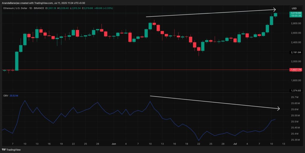 Allerdings scheint ein wichtiger Indikator eine Warnung auszusprechen: Trotz des Preisanstiegs von ETH hat das On-Balance-Volume (OBV) seinen vorherigen Höchststand nicht übertreffen können. Diese Divergenz deutet darauf hin, dass das Volumen den Anstieg nicht vollständig unterstützt – ein klassisches Zeichen für nachlassende Dynamik.