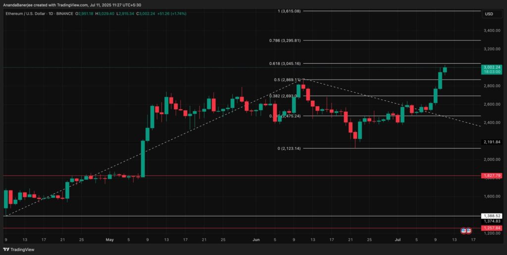 Aus technischer Sicht bringt der jüngste Anstieg von Ethereum über 3.000 $ den Kurs in eine Schlüssel-widerstandszone: die Fibonacci-Extension 0,618. Dies positioniert 3.045 $ als unmittelbaren Widerstand und 3.295 $ (Fibonacci-Niveau 0,786) als nächste Obergrenze, falls der Aufwärtstrend anhält.