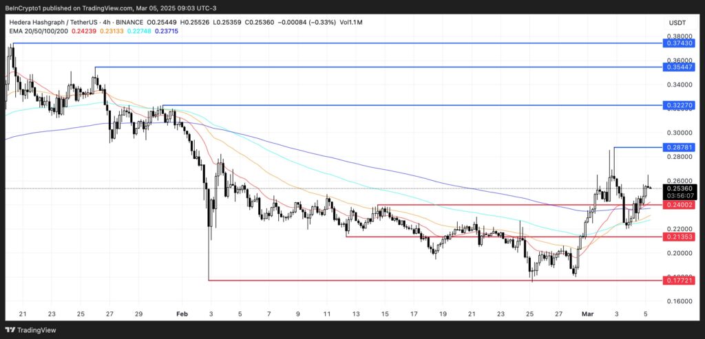Wenn dieser Trend anhält, könnte HBAR bald den entscheidenden Widerstand bei 0,28 $ testen. Ein Ausbruch über dieses Niveau würde den Weg für einen neuen Anstieg in Richtung von 0,322 $ und dann 0,35 $ öffnen. In einem optimistischeren Szenario könnte HBAR sogar die symbolische Marke von 0,40 $ überschreiten, ein Niveau, das seit November 2021 nicht mehr erreicht wurde.