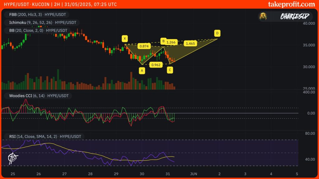 Die Bewegung begann, nachdem HYPE auf dem Niveau von 35,06 Dollar (Punkt X) abgewiesen wurde, was zu einem Rückgang von 13% und einer Unterstützung bei etwa 30,65 Dollar (Punkt A) führte. Diese Phase bildete das erste Bein XA des harmonischen Musters.
