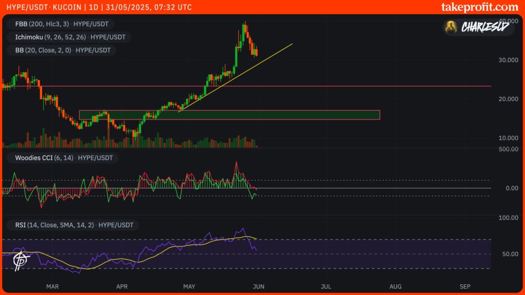 Darüber hinaus hat sich eine bedeutende Aufwärtstrendlinie gebildet, wobei die Unterstützung jetzt bei 29 Dollar liegt. Wenn HYPE unter diese Trendlinie fällt, könnte eine Welle von Verkäufen und Liquidationen den Kursrückgang verstärken.