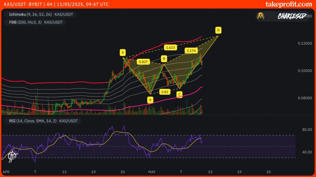 Der KAS-Token, native auf der für sofortige Proof-of-Work-Zahlungen optimierten Kaspa Blockchain, wird derzeit bei ungefähr 0,1060 $ gehandelt. Nachdem er Ende April ein lokales Tief von 0,08273 $ erreicht hatte, ist der Kurs schnell gestiegen und zeigt ein Muster, das von professionellen Händlern gut bekannt ist: das „Bearish Crab“.