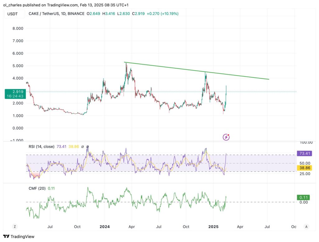 Aktuell bei einem Preis von 2,95 Dollar stieß CAKE auf einen Widerstand zwischen 3,13 und 3,4 Dollar. Danach zeigt eine Trendlinie einen starken Widerstand bei 4,3 Dollar. Auf der anderen Seite ist der RSI überhitzt und deutet darauf hin, dass CAKE explodieren könnte, wenn BTC in den nächsten Tagen nicht fällt.