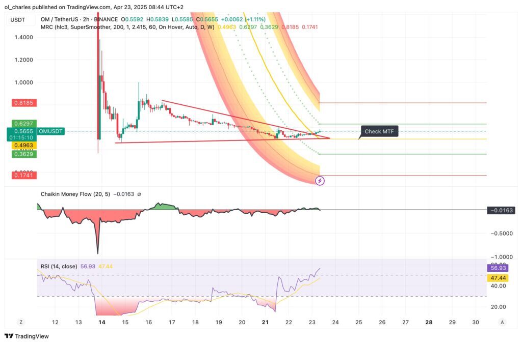 Bevor man über eine Rückkehr auf 1 Dollar spekuliert, hat OM gerade erst einen Abwärtstrend in 2 Stunden verlassen. Der Mean Reversion Channel zeigt einen Widerstandsbereich zwischen 0,74 und 0,90 Dollar, in dem OM erneut auf den Abwärtspfad geraten könnte, falls der Markt diese Euphorie nicht zulässt.