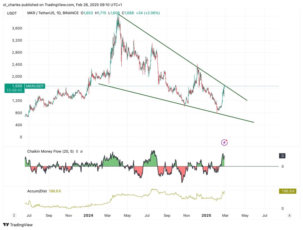 Ein Durchbruch dieses Widerstands und ein Festhalten in diesem Bereich würden den Aufwärtstrend von MKR wahrscheinlich weiter fortsetzen, möglicherweise bis zu einem neuen Allzeithoch.