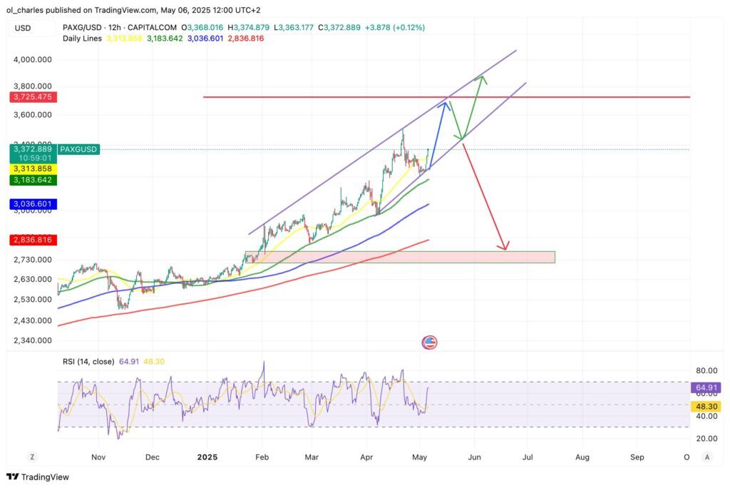 Aufwärtstrend: PAXG bewegt sich über seinen 20-Tage-Durchschnitt (3300 $) und 50-Tage-Durchschnitt (3050 $), was einen positiven Momentum bestätigt.