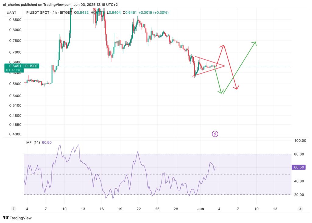 Tatsächlich bleibt PI bei 0,64 Dollar stecken. Die Verengung des MRC deutet auf eine bevorstehende starke Bewegung hin. Pi wird zwischen der südlichen Trendlinie bei 0,61 Dollar und einer nördlichen Liquiditätszone bei 0,8 Dollar hin- und hergerissen.