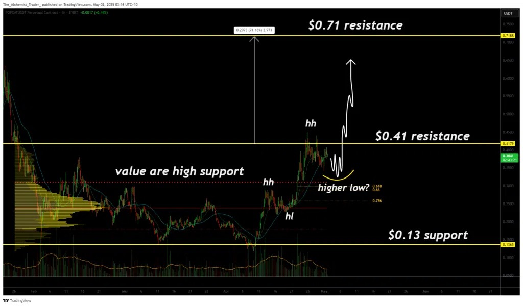 POPCAT verzeichnet seit seinem Tiefststand von 0,13 $ einen beeindruckenden Aufwärtstrend. Der Memecoin steht jedoch vor einem wichtigen Widerstand bei 0,41 $. Traders stehen vor der Entscheidung: Korrektur oder Fortsetzung des Aufschwungs?
