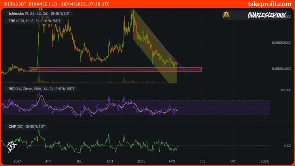 SHIB bewegt sich seit Anfang 2025 in einem Bärenkanal. Zum Zeitpunkt der Veröffentlichung lag das Krypto an einem kritischen Widerstandsniveau, das die obere Grenze dieses Kanals markierte.