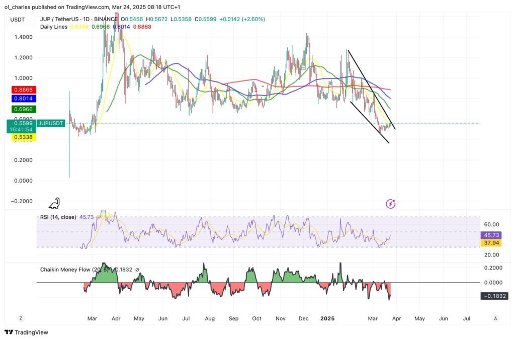 JUP nähert sich nun dem oberen Widerstand des Wedges und dem 20-Tage-Durchschnitt. Ein bullischer Ausbruch und Test könnten den Preis zum 100-Tage-Durchschnitt und in den Bereich von 0,86 $ treiben, was ein Potenzial für einen Anstieg von 55 % gegenüber den aktuellen Levels bedeutet.