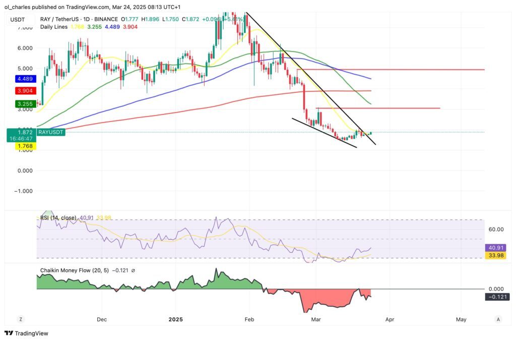 Nach diesem Aufwärtsausbruch ist RAY auf seinen aktuellen Preis von 1,87 $ gestiegen. Wenn das Momentum positiv bleibt, liegt der nächste wichtige Widerstand bei etwa 3,02 $. Ein starker Anstieg über dieses Niveau könnte den Weg zu den gleitenden Durchschnitten von 50 und 100 Tagen sowie zur Zone von 4,90 $ öffnen, was ein Potenzial für einen Anstieg von 160 % gegenüber den aktuellen Levels markiert.