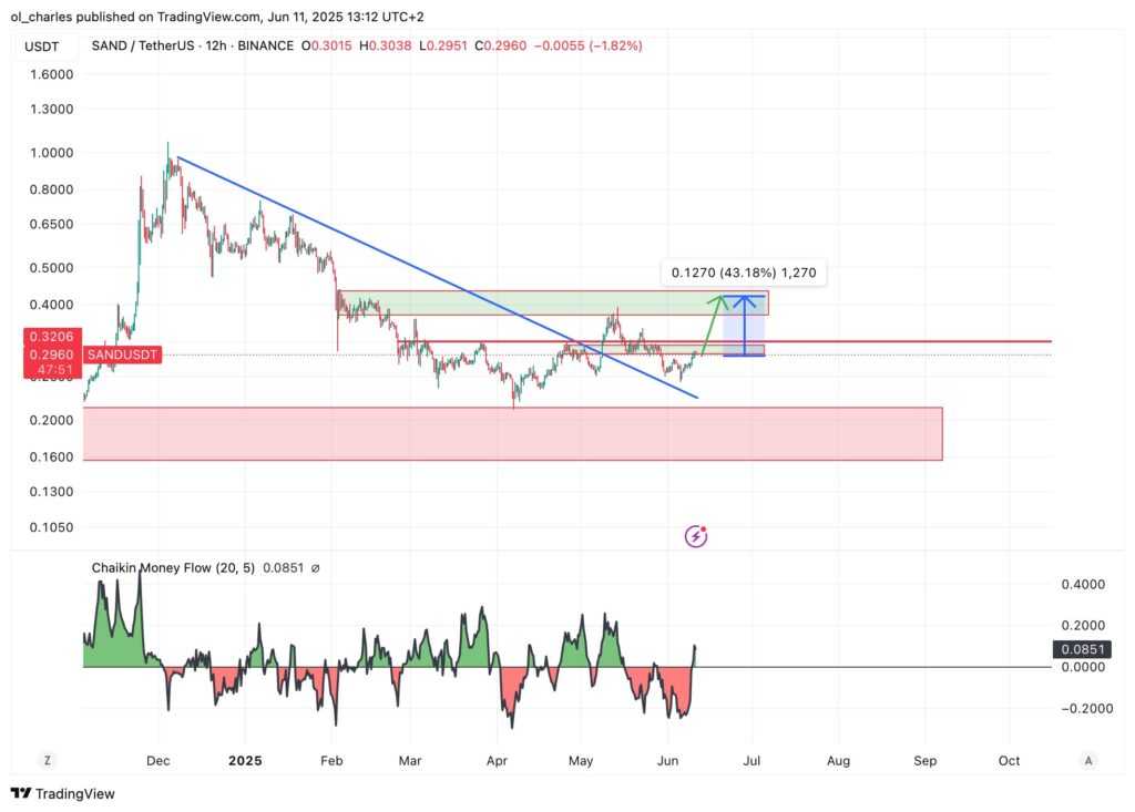 Wenn SAND den wichtigen Widerstand bei 0,31 Dollar durchbricht, könnte es potenziell auf 0,42 Dollar steigen, was einem Anstieg von etwa 43 % in den nächsten Wochen oder Tagen entspricht, falls Bitcoin die Bewegung beschleunigt.