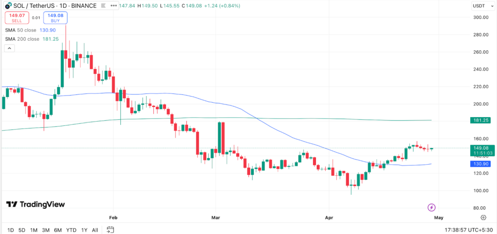 Am 29. April 2025 notiert Solana bei rund 148,96 US-Dollar, nachdem es am Vortag ein wöchentliches Hoch von 153 US-Dollar erreicht hatte. Diese Aufwärtsbewegung erfolgt vor dem Hintergrund einer positiven Dynamik bei den Altcoins und eines haussierenden Bitcoin-Marktes.