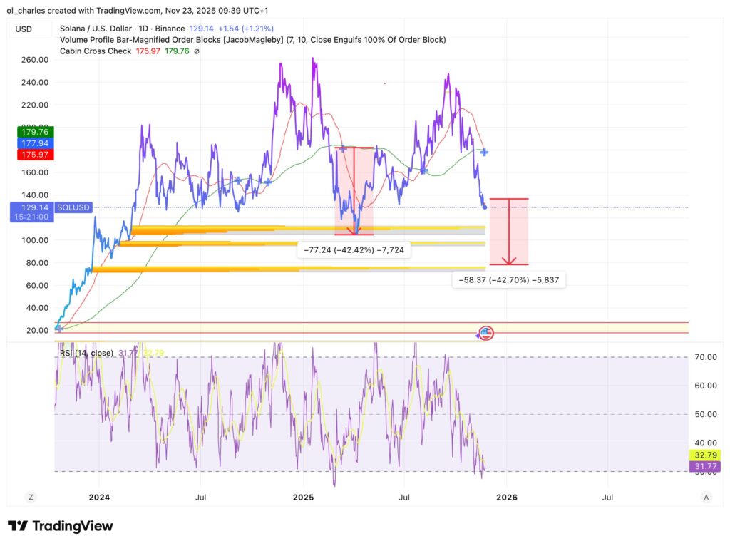 Solana erleidet einen intensiven Verkaufsdruck, der den Kurs auf ein kritisches Unterstützungsniveau zurückführt, das seit über sieben Monaten nicht mehr getestet wurde. Der SOL-Token wird derzeit bei rund 128 US-Dollar gehandelt, eine Schwelle, die nachgeben könnte, wenn sich die Krypto-Marktbedingungen weiter verschlechtern. Die aktuelle technische Konfiguration weckt berechtigte Bedenken bei Tradern, da sich die Bärensignale häufen, während die allgemeine Marktstimmung fragil bleibt.