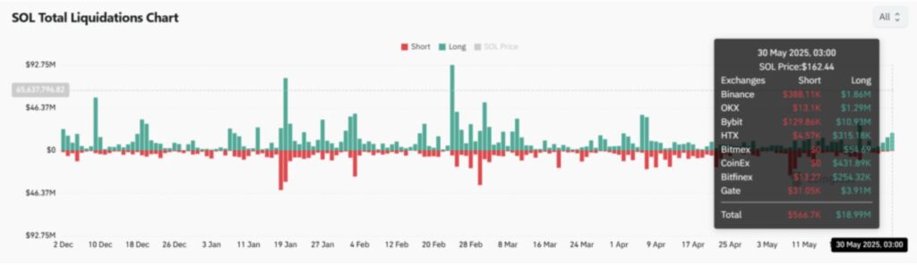 Die Liquidationsdaten zeigen ein deutliches Ungleichgewicht zwischen Long- und Short-Positionen. Am 30. Mai beliefen sich die Long-Liquidationen auf insgesamt 18,99 Millionen Dollar, während die Short-Liquidationen nur 566,7 Tausend Dollar erreichten. Mit konvergierenden technischen Durchbrüchen, bärischer Stimmung, negativer Finanzierung und aggressiven Verkäufen steht SOL vor einer kritischen Situation.