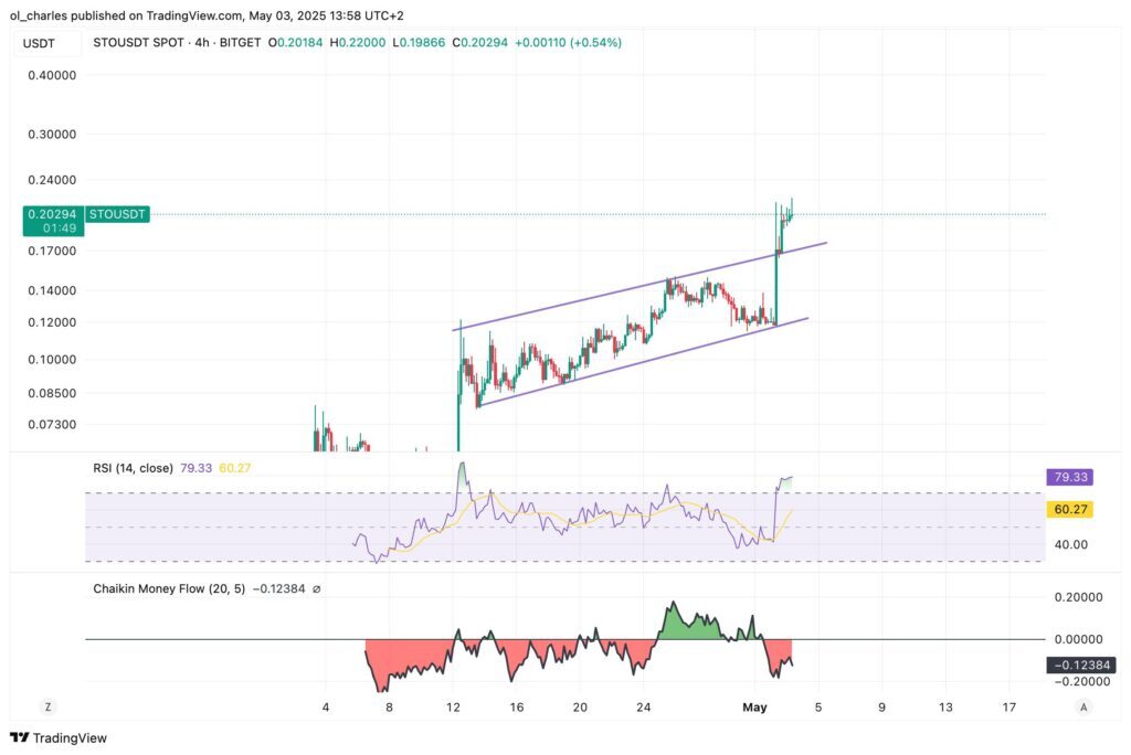 Ein Airdrop von 15 Millionen STO (1,5 % des Gesamtangebots) für die Nutzer von BNB Simple Earn hat ebenfalls das Interesse angekurbelt. Dieser „Binance-Effekt“ – ein durchschnittlicher Anstieg von 41 % nach dem Listing – zusammen mit vorherigen Listings auf MEXC, Bitget und KuCoin, haben STO seit seinem TGE am 3. April 2025 um 200 % angetrieben.