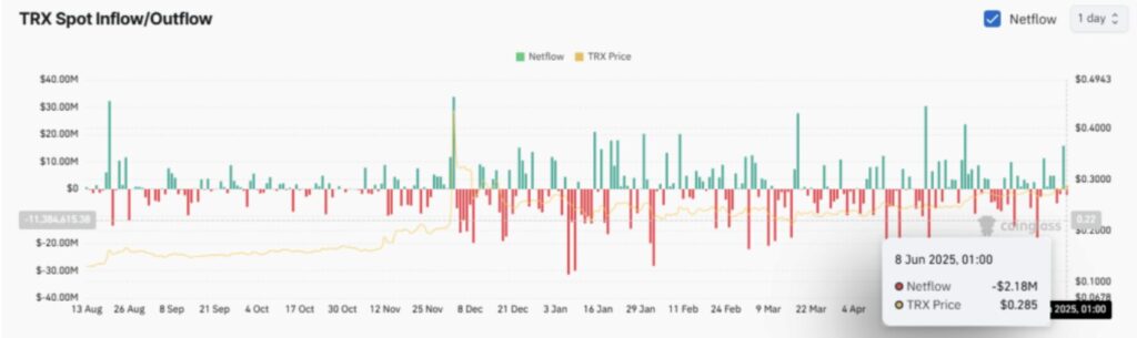 Trotz dieser gemischten Signale scheint das Wachstum von TRX in den letzten 24 Stunden durch OTC-Händler angetrieben worden zu sein, die den Altcoin aktiv kaufen. Tatsächlich zeigen die Daten zu den Ein- und Ausflüssen von TRX an den Börsen, dass in den letzten 24 Stunden mehr Käufe getätigt wurden als in den vorherigen Zeiträumen.