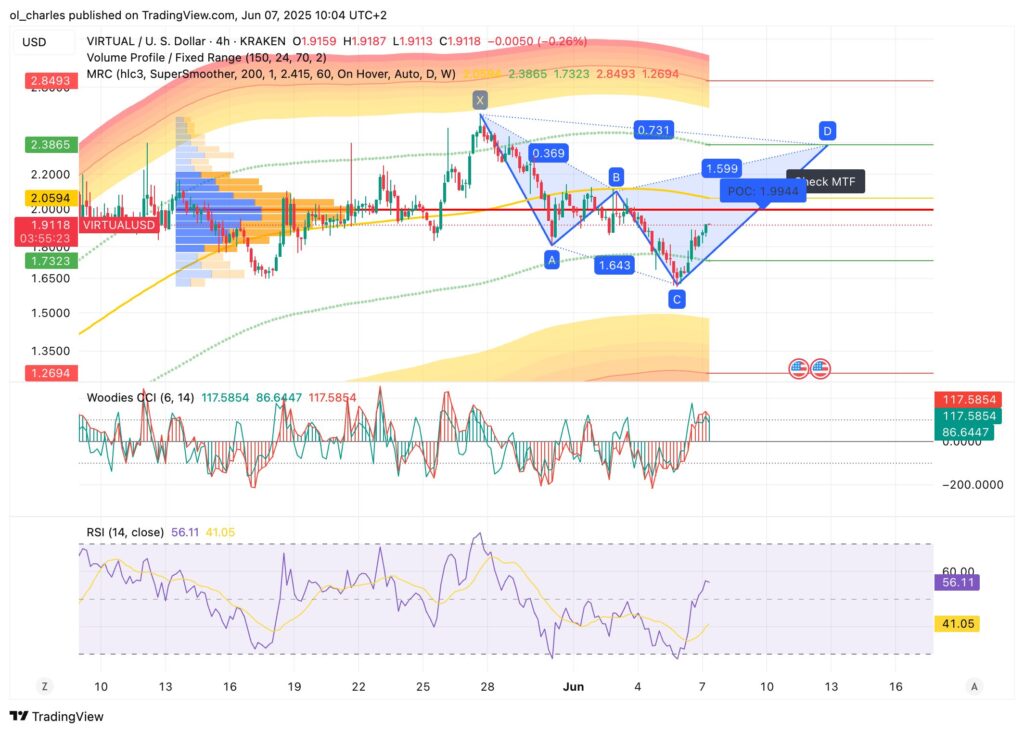 Bei der Betrachtung des 4-Stunden-Charts von VIRTUAL lässt sich die Bildung eines bärischen Cypher-Harmonics-Musters erkennen. Diese Art von Formation, die oft mit einem kurzfristigen bullischen Momentum verbunden ist, könnte in den nächsten Trading-Sessions eine substanzielle Erholung für VIRTUAL ankündigen.