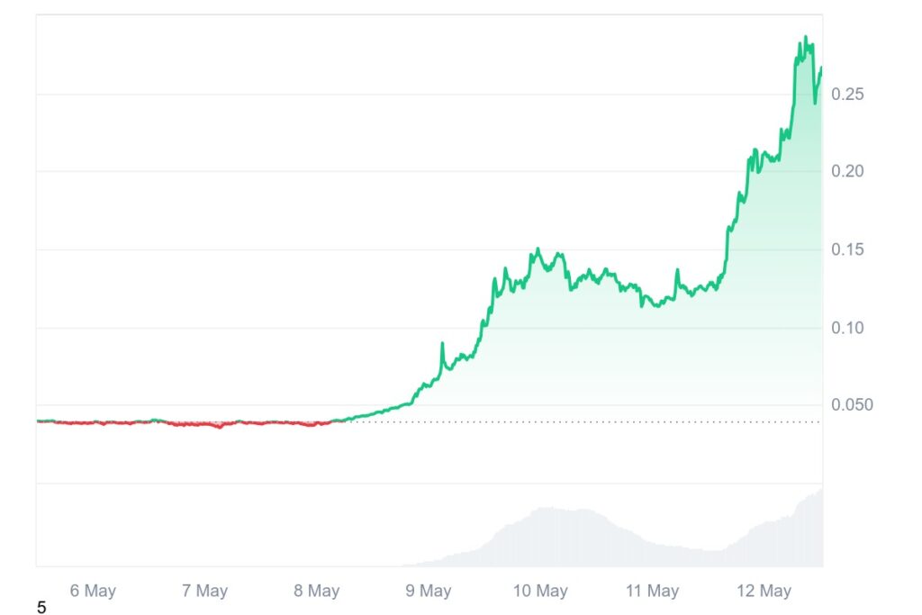 Zu Beginn verzeichnete Moo Deng einen steilen Anstieg und erreichte ein historisches Hoch von 0,6911 $. Jedoch wie viele Memecoins fiel er schnell, nachdem der Hype vorbei war. Heute ändert sich das Bild. Allein in den letzten sieben Tagen stieg Moo Deng um 573 %, davon allein 110 % gestern, und liegt nun bei rund 0,2730 $.