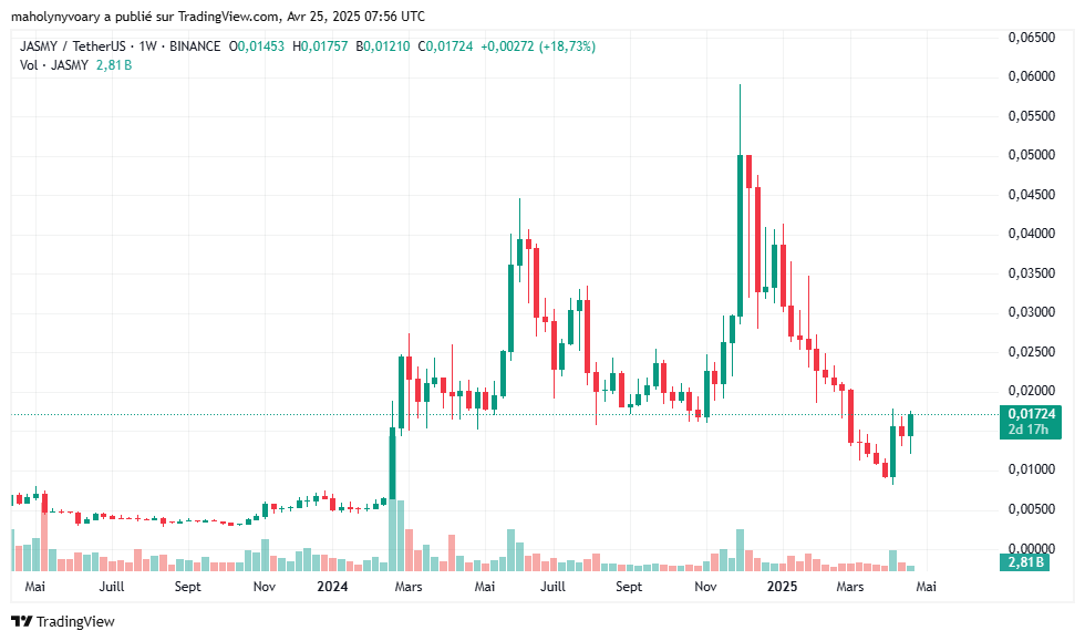 Aktuell wird JASMY bei etwa 0,017 Dollar gehandelt, mit einer Marktkapitalisierung von ungefähr 750 Millionen Dollar. Diese Bewertung, obwohl niedriger als ihr historischer Höchststand, stellt eine signifikante Steigerung gegenüber den Tiefständen von 2023 dar.