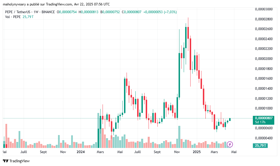In den ersten Monaten des Jahres 2025 zeigte PEPE Anzeichen einer Konsolidierung nach einer Periode hoher Volatilität Ende 2024 :
