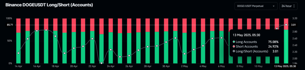 Additionally, the number of daily active addresses on the Dogecoin network has also increased by 34.91% over the same period, reflecting this bullish momentum. Coinglass data reveals a significant rise in bullish bets on Dogecoin. Currently, the long/short ratio on the DOGEUSDT pair on Binance stands at 3, indicating three long positions for every short position. This reflects a highly optimistic sentiment, with 75.08% of Binance traders holding long positions on DOGE.