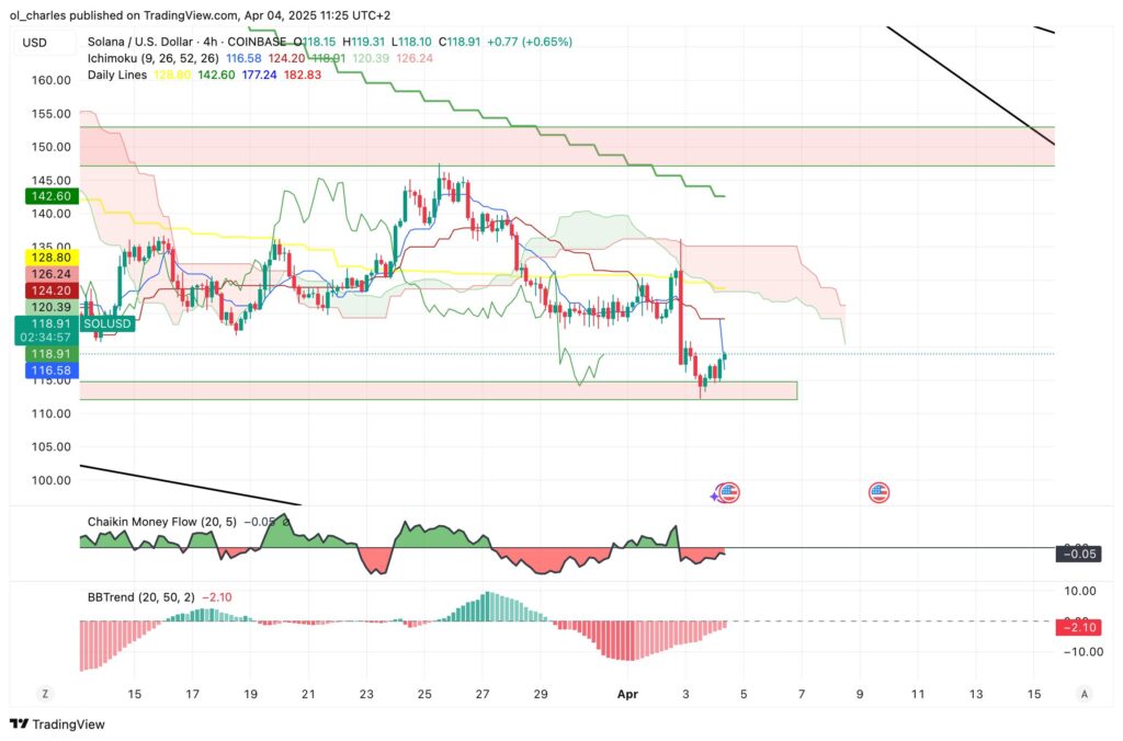 Solana’s 4-hour chart with the Ichimoku cloud currently displays concerning bearish signals. The price has clearly broken below the Tenkan-sen (blue line) and Kijun-sen (red line), confirming a clear rejection of short-term support levels.